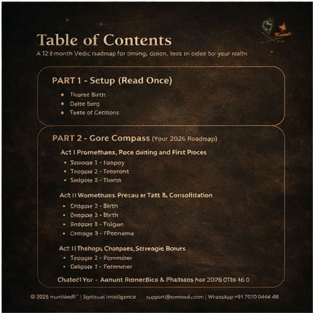 Not a snapshot. This is your full-year operating system — a 12-month Vedic roadmap built for timing, decisions, and inner steadiness. Written in clean English, focused on action (not fear), so you know when to push, when to pause, what to prioritise, and how to stay steady through the year.